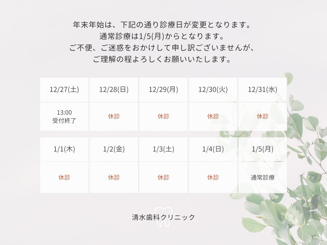 ■12/20(土)PM~16:00まで(AMは通常診療となります)